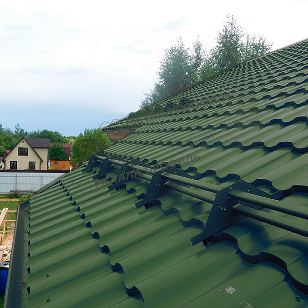 Профиль Монтекристо-SL характеризуется симметричной волной высотой 25 мм и шагом 350 мм, что создает эффект классической керамической черепицы. Толщина стали 0,5 мм обеспечивает оптимальный баланс между прочностью и весом, облегчая монтаж. Этот профиль отличается повышенной жесткостью, что минимизирует деформации под нагрузкой снега или ветра. В цвете Зеленый мох он выглядит органично на фоне зелени, подчеркивая архитектурную гармонию с окружающей средой. Профиль подходит для скатных крыш с углом наклона от 12 градусов.